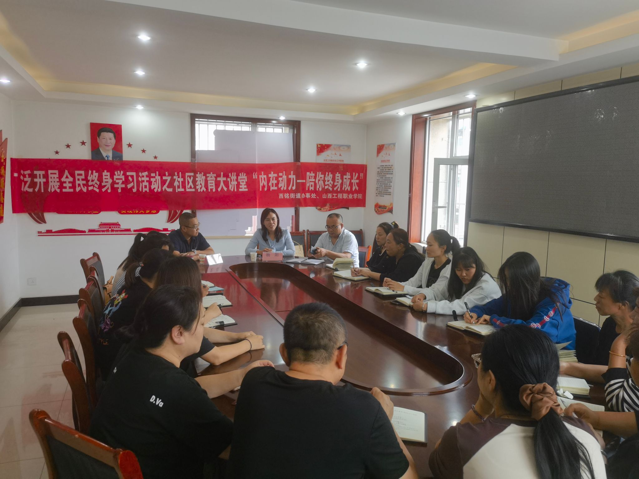 9月22日下午,我院培訓(xùn)與繼續(xù)教育部與太原市萬柏林區(qū)西銘街辦電石廠社區(qū)黨支部組織社區(qū)共建活動(dòng),邀請(qǐng)基礎(chǔ)部楊陽老師做題為《內(nèi)在動(dòng)力:陪你終身成長(zhǎng)——記我院青年教師終身成長(zhǎng)》的講座,我院培訓(xùn)與繼續(xù)教育部及社區(qū)黨支部相關(guān)人員參加了會(huì)議,會(huì)議由西銘街辦黨工委副書記朱銳主持。