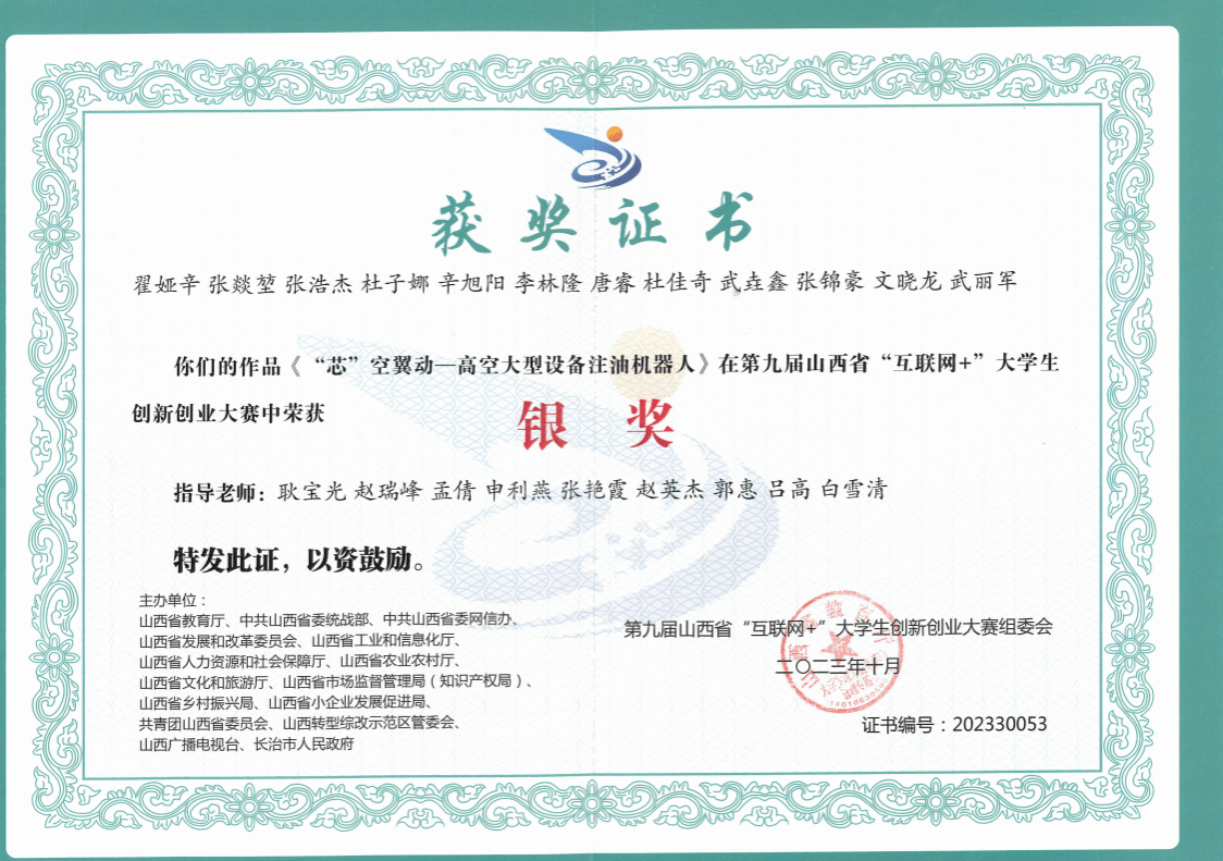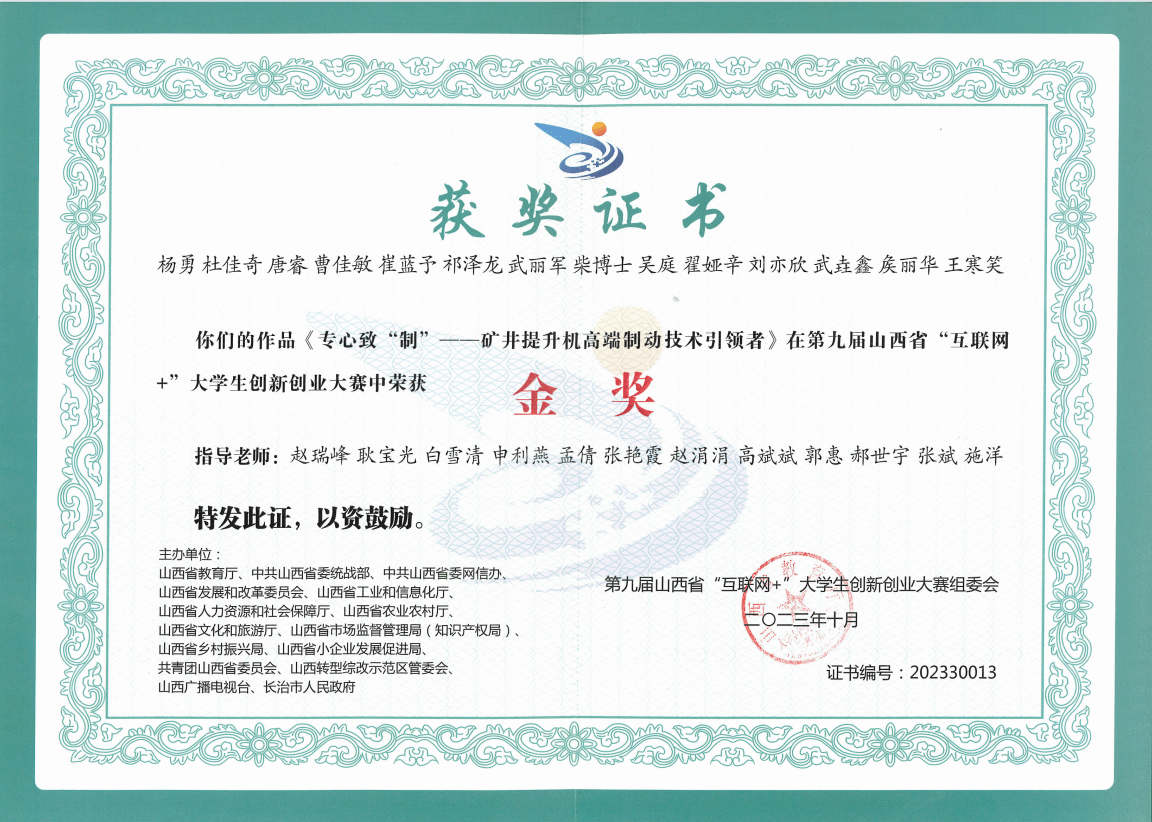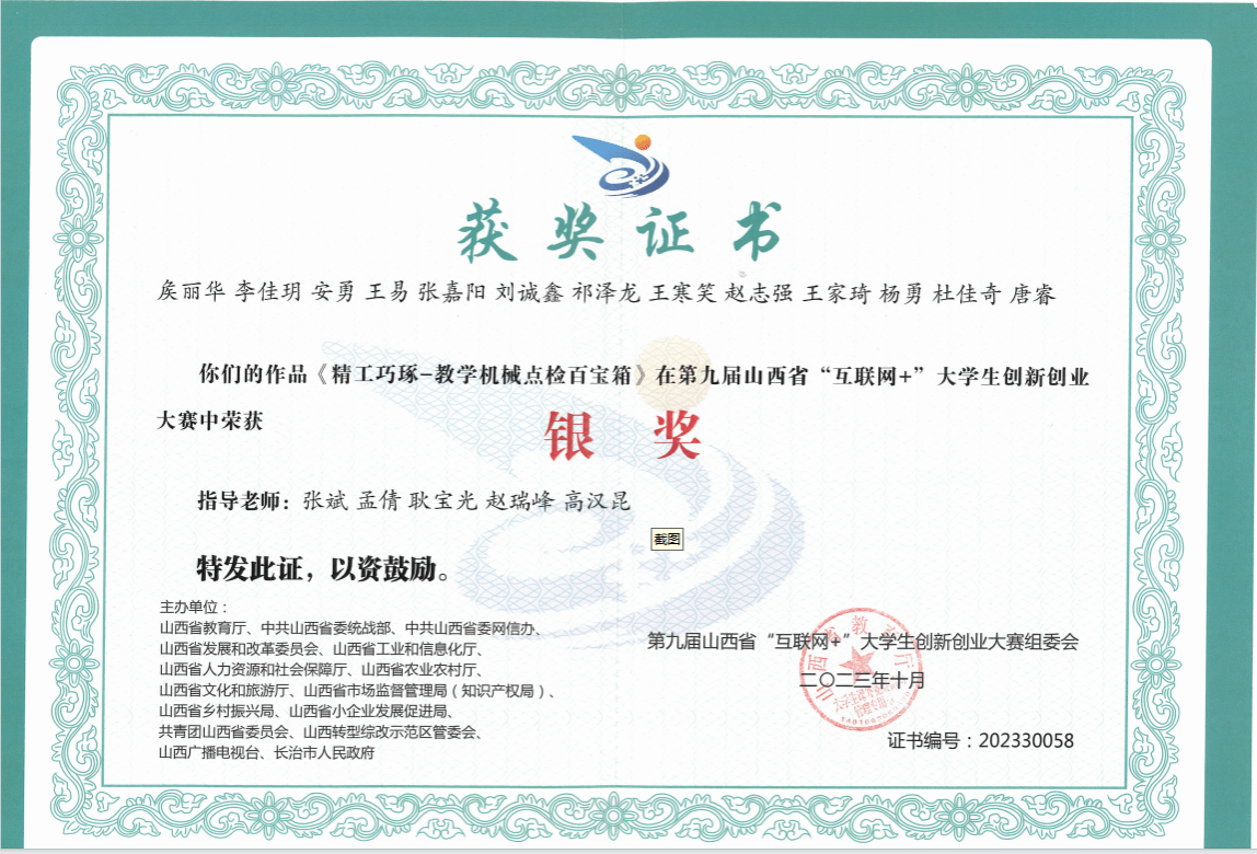 9月18日,山西省教育廳發(fā)布《山西省教育廳關(guān)于公布第九屆山西省“互聯(lián)網(wǎng)+”大學(xué)生創(chuàng)新創(chuàng)業(yè)大賽獲獎(jiǎng)名單的通知》(晉教高函〔2023〕37號(hào)),機(jī)械工程系創(chuàng)新工作室參賽項(xiàng)目在高職賽道獲得4項(xiàng)獎(jiǎng)項(xiàng),其中趙瑞峰、耿寶光兩位老師指導(dǎo)的“專心致制”項(xiàng)目獲得金獎(jiǎng),“星空翼動(dòng)”項(xiàng)目獲得銀獎(jiǎng);張斌、孟倩兩位老師指導(dǎo)的“精工巧琢”項(xiàng)目獲得銀獎(jiǎng);吳曉霞、申利燕兩位老師指導(dǎo)的“進(jìn)巷智勝”項(xiàng)目獲得銀獎(jiǎng)。