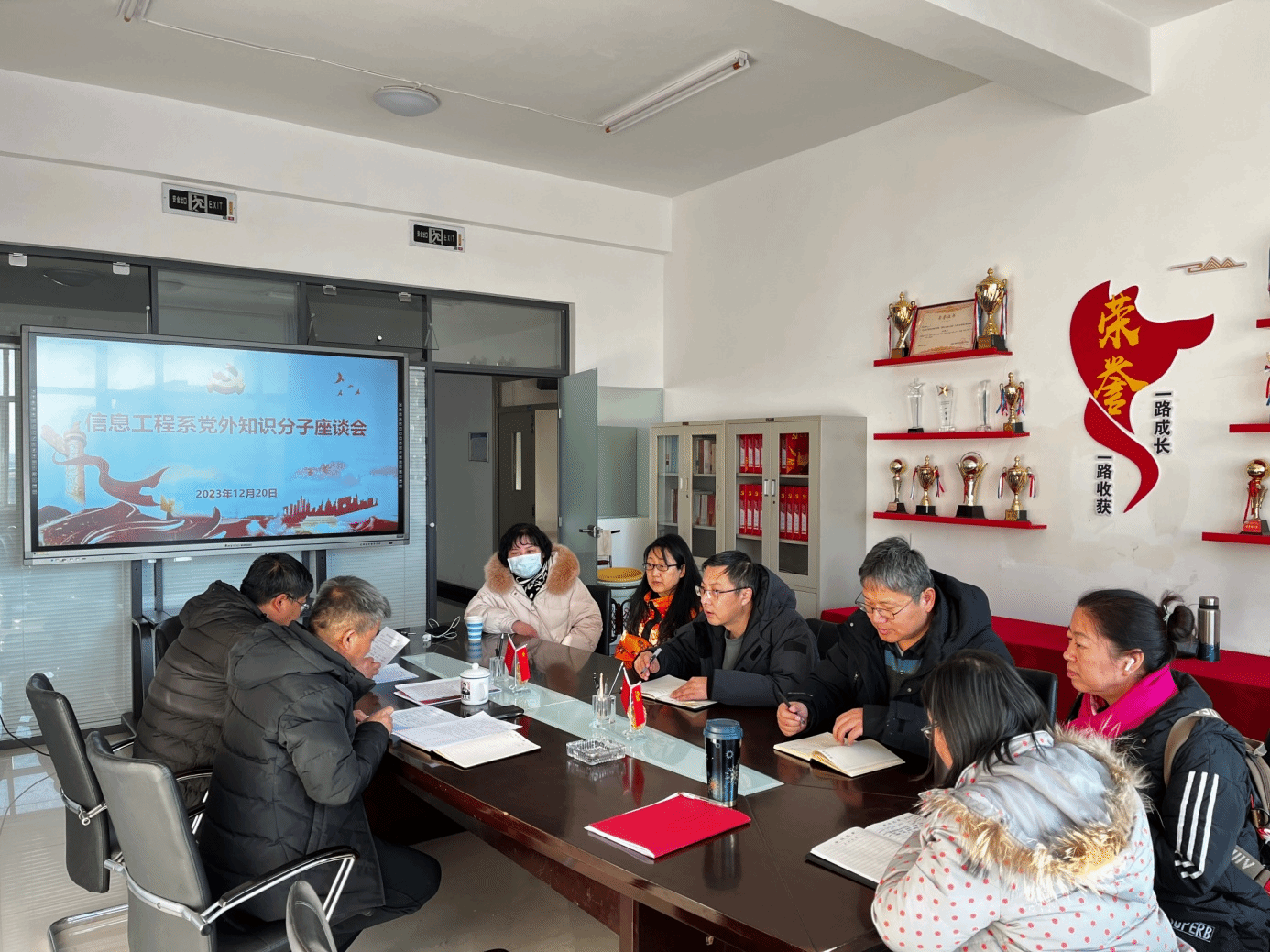 12月20日下午,信息工程系在唐槐校區(qū)AH501召開了黨外知識分子思想狀況座談會。該系共有黨外知識分子10人,其中6人參加了座談會。系總支書記馮國平、系主任李樹文、系副書記張偉麗就宗教信仰、教學(xué)情況、科研狀況、職稱晉升、家庭生活及子女就業(yè)等方面與參會教師進行了座談交流,聽取相關(guān)意見和建議。最后,馮國平表示信息工程系發(fā)展所取得的成就與廣大黨外知識分子的智慧和力量是分不開的,作為新時代高職院校的一名教師,要跟上學(xué)院教育高質(zhì)量發(fā)展的步伐,確定個人成長目標(biāo),在干事創(chuàng)業(yè)中實現(xiàn)人生價值。他希望黨外知識分子能夠深化學(xué)習(xí)、提高認(rèn)識、為學(xué)院發(fā)展獻計獻策,為服務(wù)學(xué)院新時期高質(zhì)量內(nèi)涵發(fā)展貢獻力量。