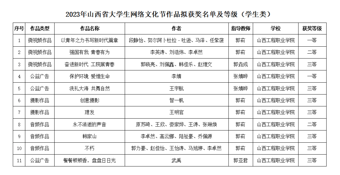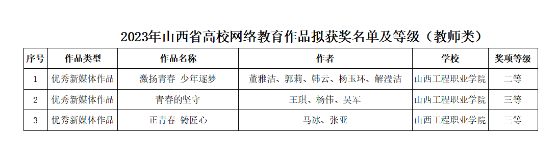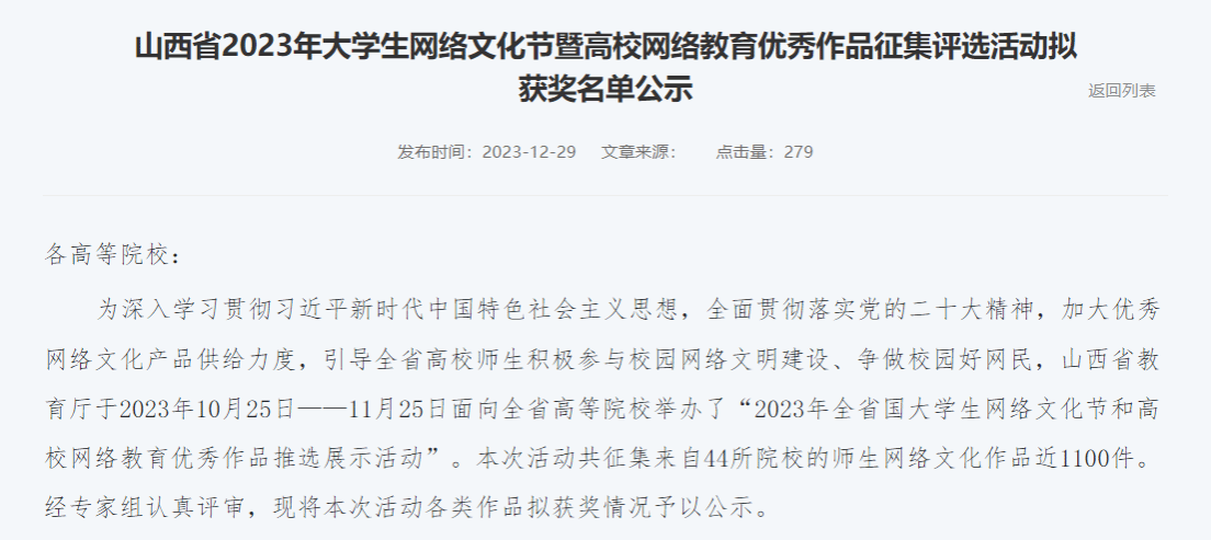 為深入學(xué)習(xí)貫徹習(xí)近平新時(shí)代中國特色社會(huì)主義思想,推進(jìn)學(xué)院網(wǎng)絡(luò)文化建設(shè),營造健康、文明、和諧的校園網(wǎng)絡(luò)文化環(huán)境,鼓勵(lì)引導(dǎo)廣大師生積極參與網(wǎng)絡(luò)文化作品創(chuàng)作生產(chǎn),我院師生積極參與2023年山西省大學(xué)生網(wǎng)絡(luò)文化節(jié)和高校網(wǎng)絡(luò)教育優(yōu)秀作品展示活動(dòng)并榮獲佳績。