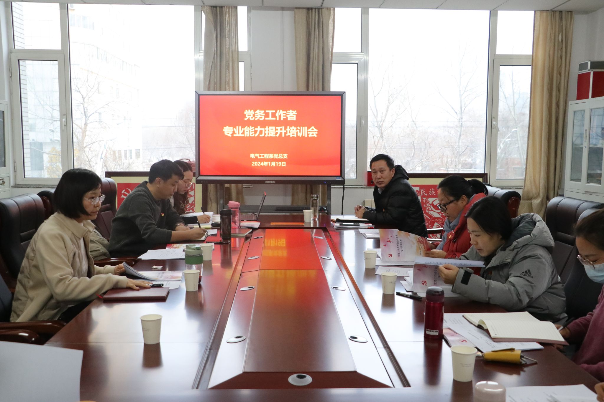 為深入貫徹落實(shí)黨的二十大精神和習(xí)近平總書記關(guān)于干部教育培訓(xùn)工作的重要指示批示精神,扎實(shí)推進(jìn)黨建工作高質(zhì)量發(fā)展,1月19日,電氣工程系黨總支在行政樓三層黨建活動室開展黨務(wù)工作者專業(yè)能力提升培訓(xùn),黨總支全體黨員參加,黨總支書記肖占勝主持。