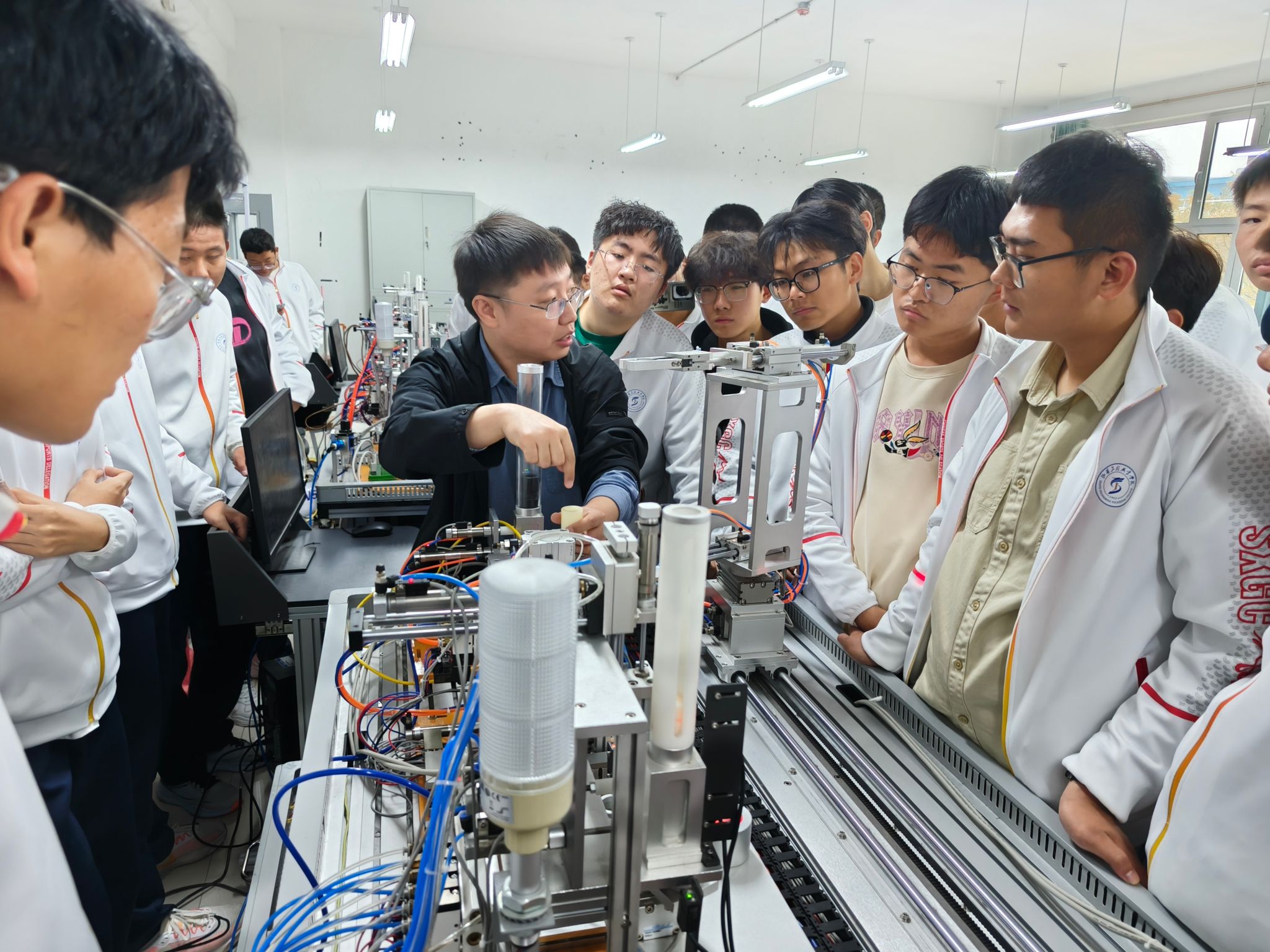 最后,機械工程系以專業(yè)為單位進行專業(yè)介紹、正高工領航及實訓室參觀活動。在各專業(yè)教室中,教研室主任以專業(yè)人才培養(yǎng)方案為主體,詳細闡述了專業(yè)特色、課程設置、就業(yè)方向等內容。正高工們則憑借自身豐富的行業(yè)經驗為新生領航,讓他們對未來的專業(yè)學習有了更清晰的認識。在實訓室參觀環(huán)節(jié),新生們近距離接觸了先進的機械設備,深切感受到了機械工程的獨特魅力和無限可能。